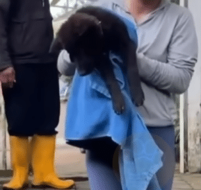 A female rescuer knelt beside him and gently wrapped him in a blue towel. She lifted him carefully, as though afraid that even the smallest movement might be too much.