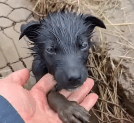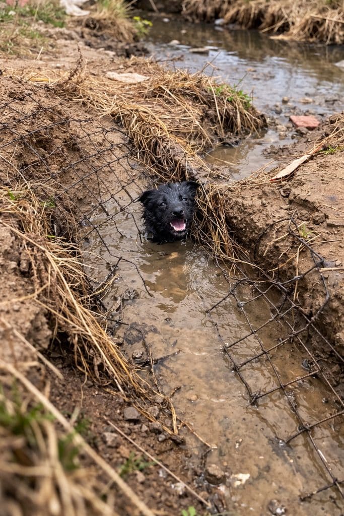 A faint cry coming from a muddy drainage ditch, where rainwater and debris had collected. A man leaned closer and spotted a tiny black “puppy” struggling in the muck.