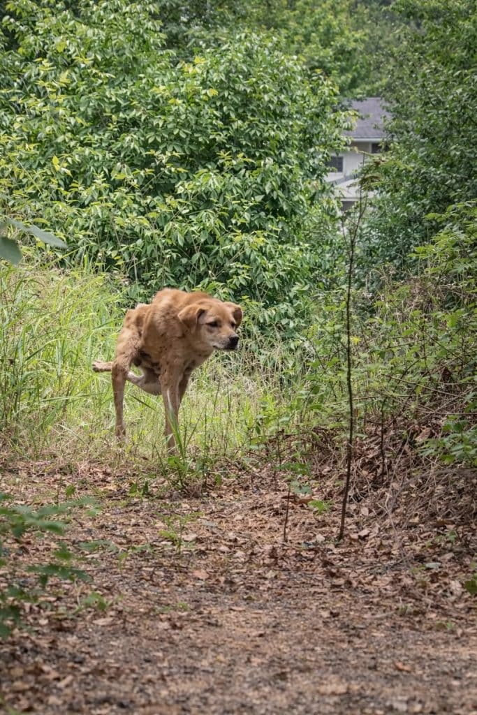 A thin stray dog struggles through dry bushes, pulling his body forward using only his front legs. His back legs lie motionless behind him.