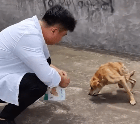 The dog hesitates at first — life on the streets has taught him caution.