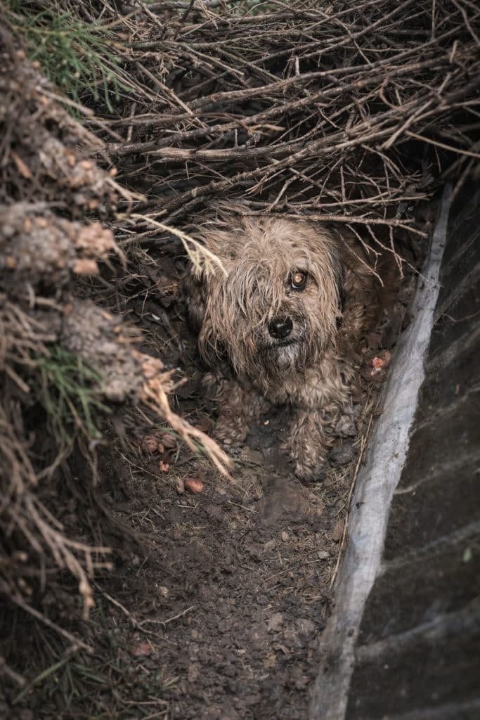 Tiny bodies pressed together, whining softly from hunger and cold. There is no proper shelter. Just damp ground and scattered debris.