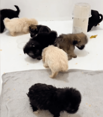 The puppies begin learning simple habits, including where to relieve themselves. At first, they are clumsy and confused.
