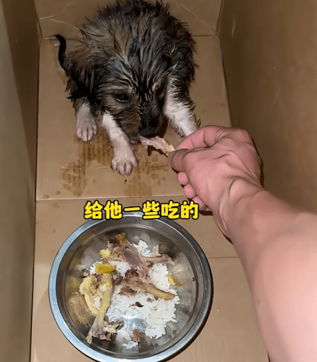 He ate eagerly — meat and rice disappearing quickly.