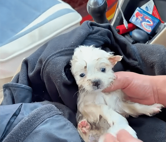 A tiny white puppy, trapped in the freezing water, struggling to stay above the surface. His body trembled violently. His fur was soaked through, clinging to his fragile frame.