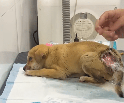 Just a single moment — a fragile dog leaning against a wall, trembling after a sudden shock.