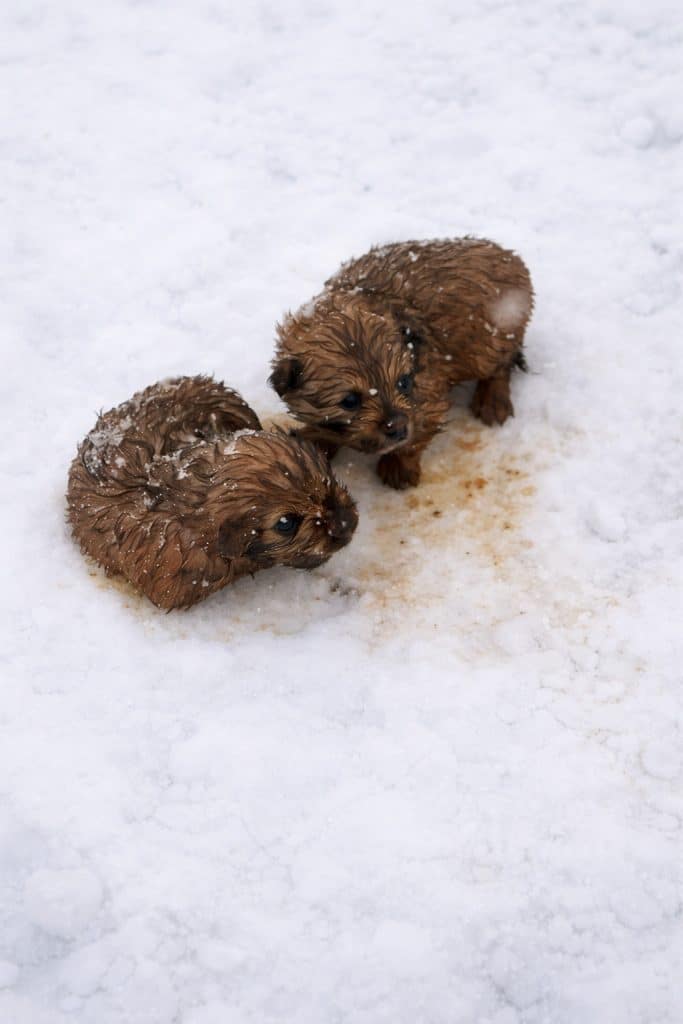 Curled tightly together in the middle of the white, frozen ground were two tiny, soaked puppies. Their fur was stiff with ice. Snow had begun to collect over their small bodies. They were trembling — not with energy, but with the last efforts of survival.