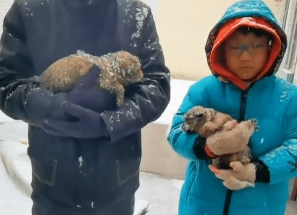Without hesitation, the father scooped them up. His son held them close as they rushed home, their small bodies barely moving against the cold.
