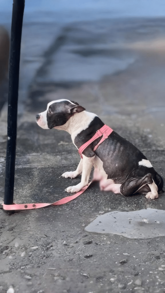 She was tied to a metal pole along a busy sidewalk, surrounded by traffic, noise, and the steady flow of people rushing past. The pavement beneath her paws was hot. The air was heavy. There was nowhere to escape the chaos around her.