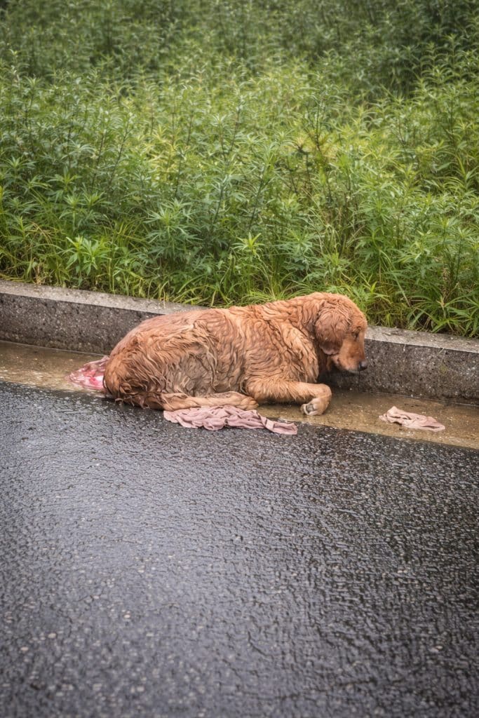 Cars passed without slowing. Water pooled near the curb, mixing with dirt and oil from the pavement. And in the middle of it all lay a Golden Retriever, soaked and trembling.