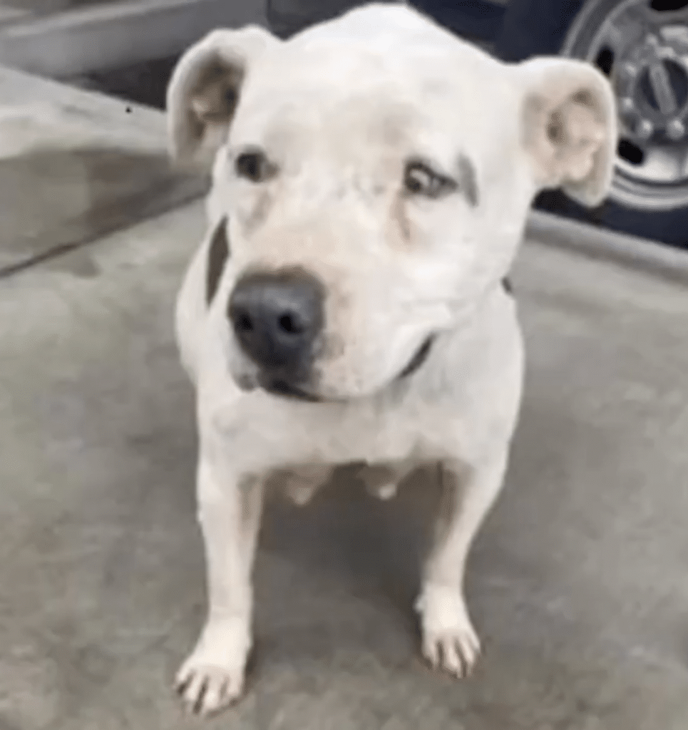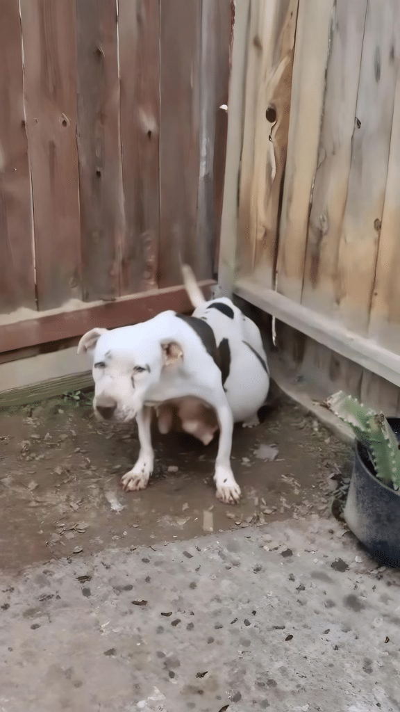 Tucked beneath overgrown plants lay a Pitbull mix, pressed low against the ground as if trying to disappear. At first glance, she barely moved. Her body was thin. Her posture tense. When she lifted her head, her eyes revealed exhaustion mixed with uncertainty.