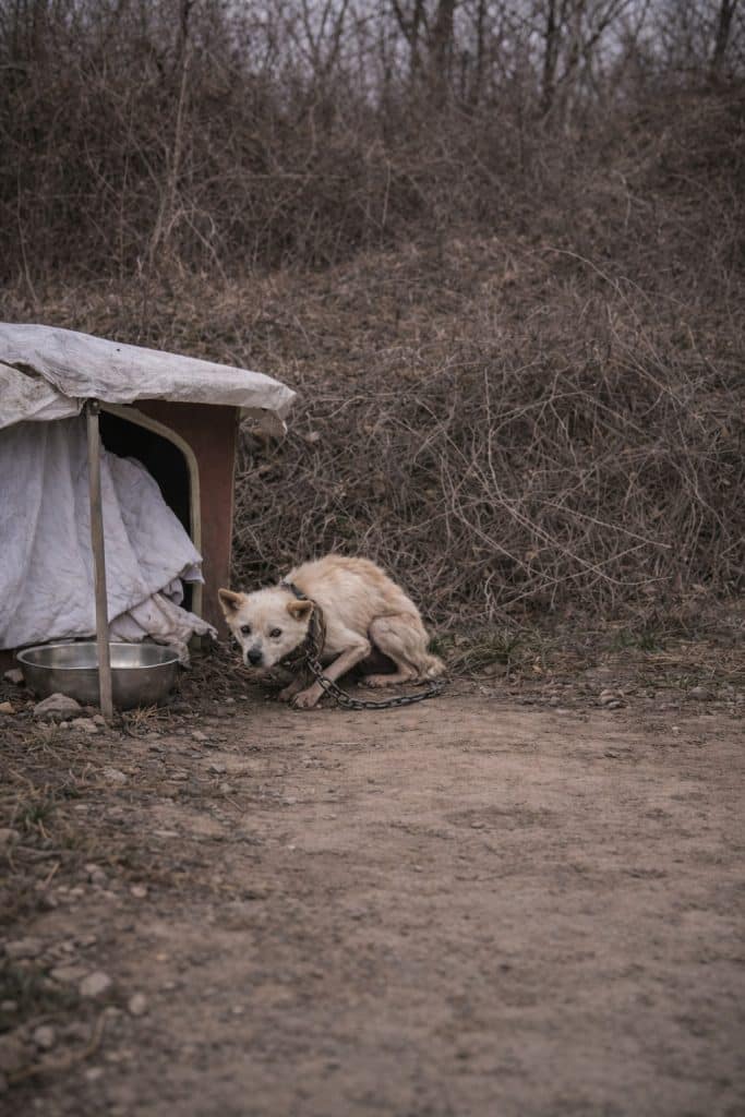 The moment they stepped closer, she panicked. Though the chain limited her movement, she pulled desperately against it, circling the same patch of dirt over and over.