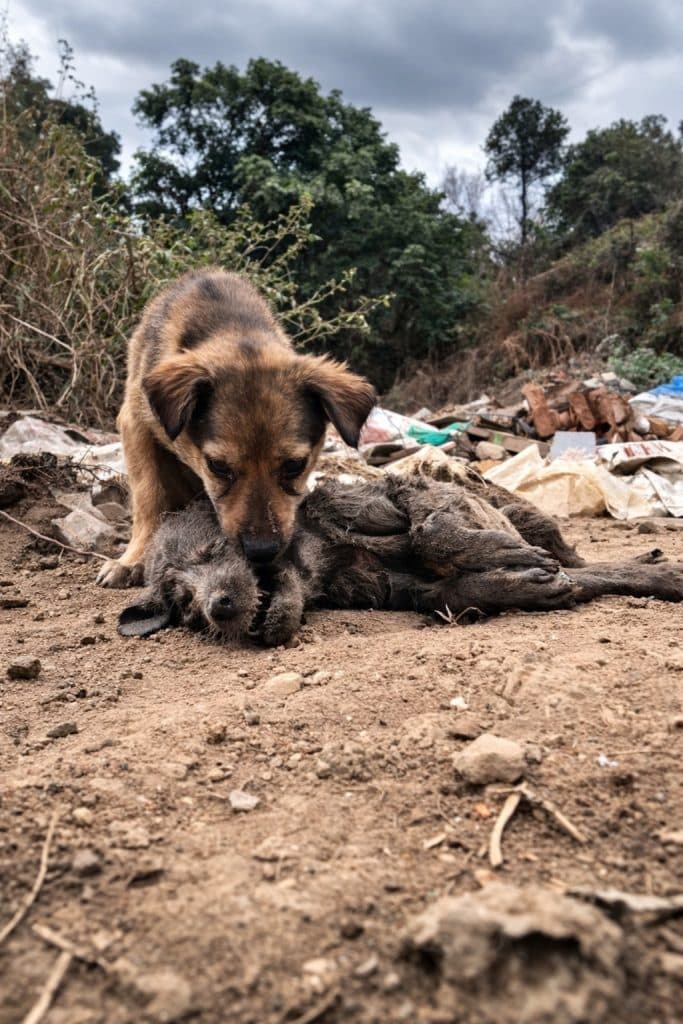 The young rescuer gently lifted the surviving puppy and placed him in a safe spot. Then, wearing medical gloves, he carried the other small body to a nearby patch of open ground.