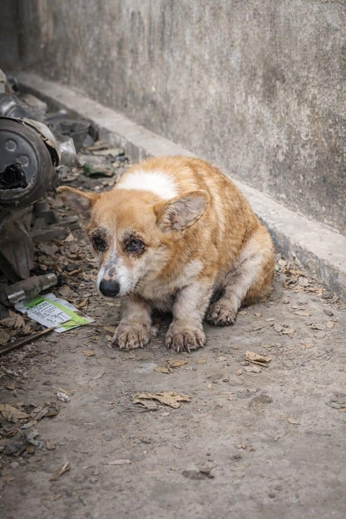 Underneath an old parked motorcycle, a small dog had curled his body tightly against the ground. His coat suggested a Corgi mix, though it was difficult to tell clearly because his fur was dull and unkempt.