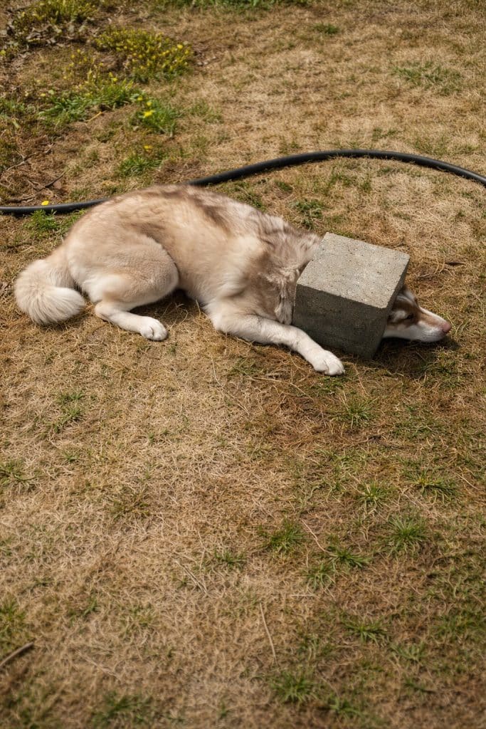 At first, Skya’s owners tried to gently help her free herself, but the block was heavy and the opening too tight. The more the dog moved, the more stuck she seemed to become.