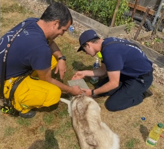 The rescue teams applied lubricants around the dog’s neck and the edges of the concrete opening to reduce friction.