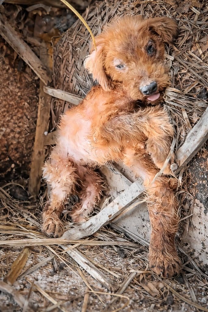 The little dog was severely malnourished. His ribs were sharply visible beneath fragile skin. Much of his fur had fallen away, leaving irritated patches of exposed skin behind. His body showed clear signs of a serious skin condition that had been left untreated for far too long.