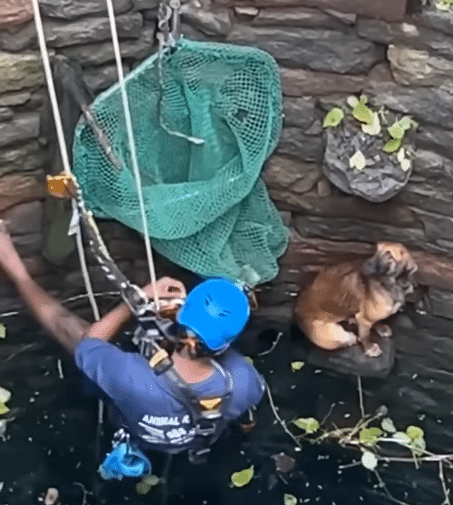 When the rescuer finally reached the bottom of the well, the frightened dog remained pressed against the narrow ledge.