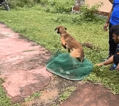 The rescuers opened the net and stepped back, allowing the dog to move freely.