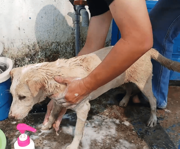 The frightened dog who had once been bound and silent now stood patiently as they cleaned him.