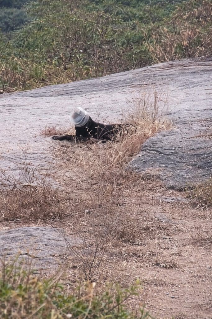For this black dog, the danger came not from nature but from something humans had left behind. A simple plastic container became a life-threatening trap for an animal trying to survive in the wild.