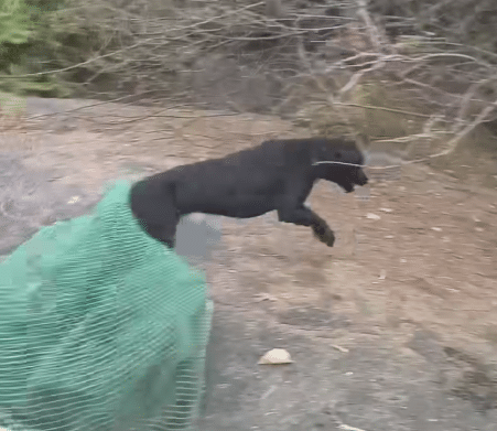 Carefully positioning themselves across the hillside, they waited for the right moment. When the dog paused briefly between rocks, the team quickly spread a large rescue net.