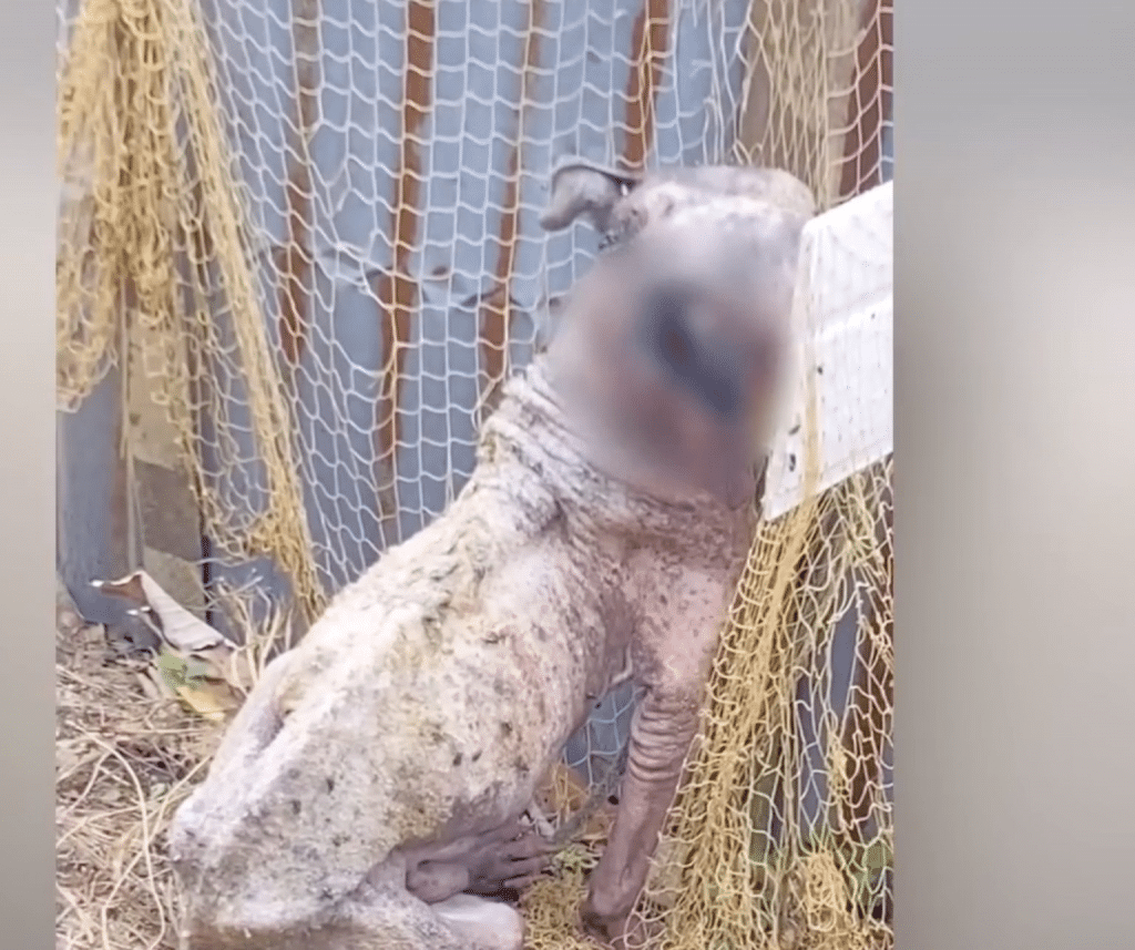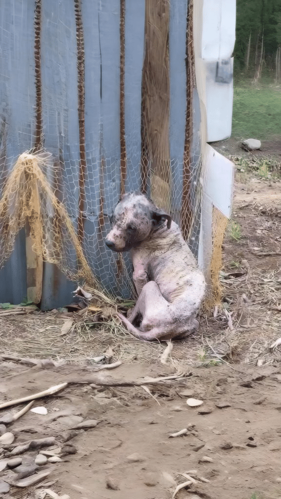 The rope around his neck was short, allowing him little room to move. His body was thin, his fur dusty and tangled, marked by days — perhaps longer — without consistent care. He didn’t bark for attention. He didn’t pull against the rope or cry out. Instead, he sat quietly, curled inward, as if trying to make himself invisible.