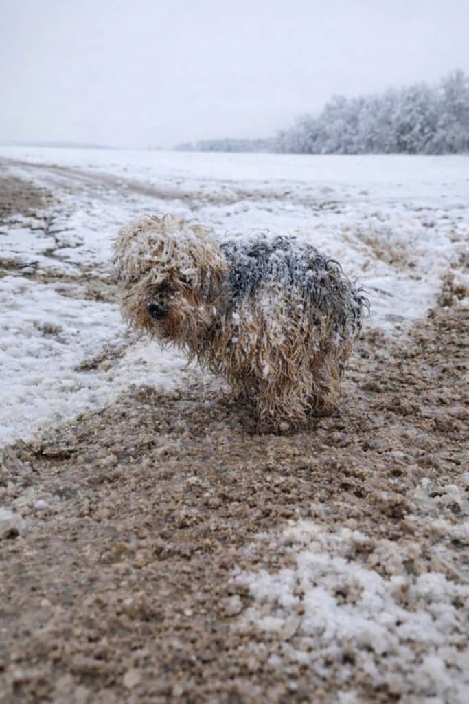 Barbosik’s fur was tangled, stiff, and partially frozen. Snowflakes clung to his coat, turning him into a small, shivering bundle struggling to remain upright. It was clear he had been outside for a long time.