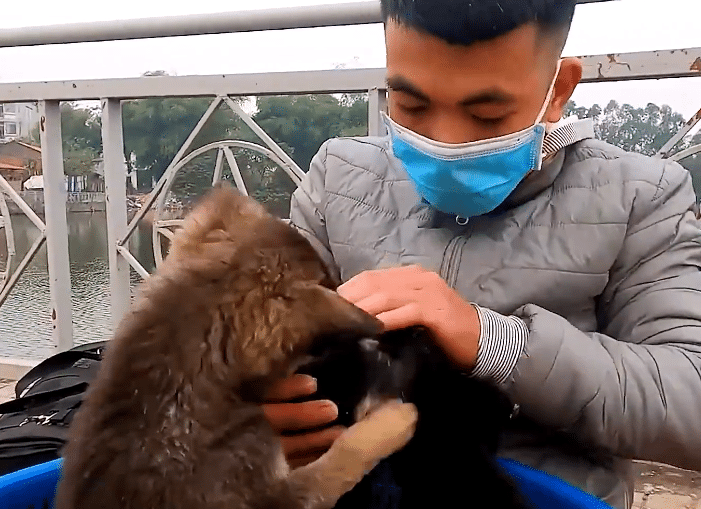 She saw the puppy, paused for a moment, and gently picked him up. His tiny body fit easily into a simple paper bag she had brought with her.