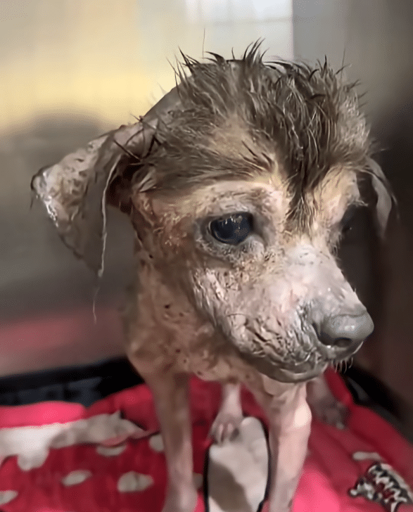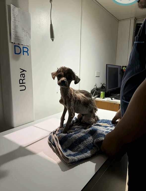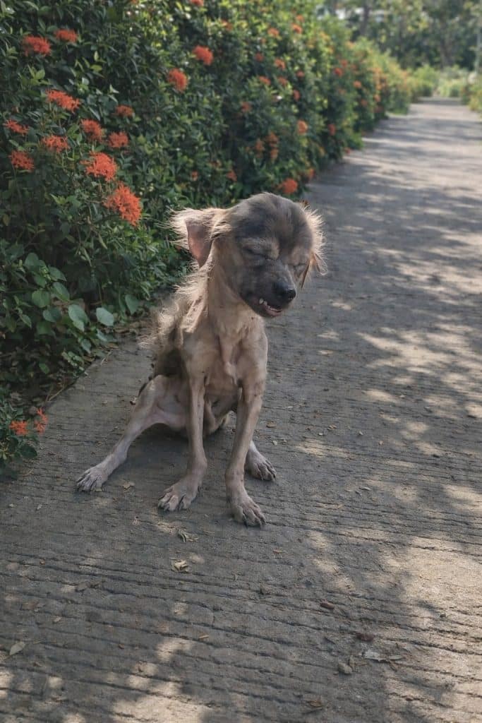 His body was painfully thin, and large patches of fur were missing from his coat. The exposed skin beneath showed clear signs of irritation and illness. He sat leaning slightly to one side, as if it required great effort just to remain upright.