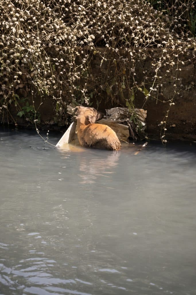 The water was dirty and difficult to move through, but the rescuer slowly approached the frightened pup, speaking softly to keep it calm.