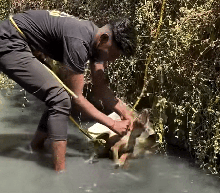 Seeing the frightened mother dog and hearing her persistent cries, the person quickly contacted Saahas Animal Rescue, a group known for responding to animals in urgent situations.