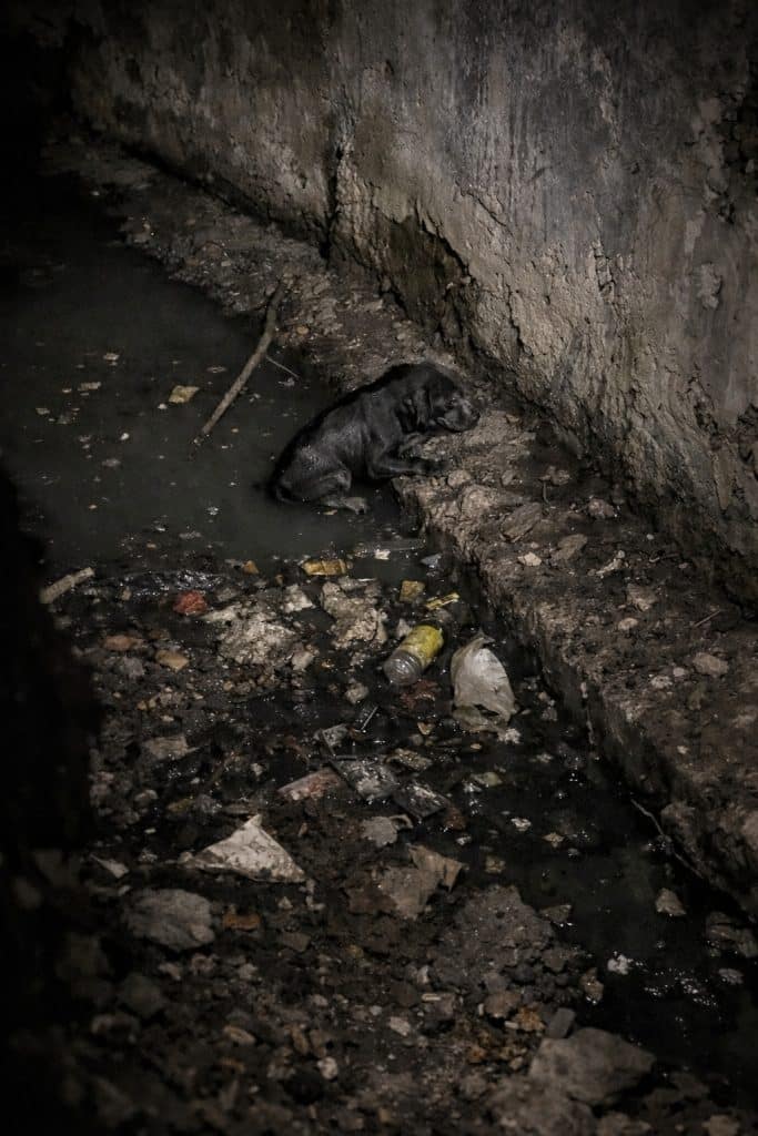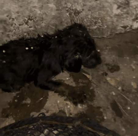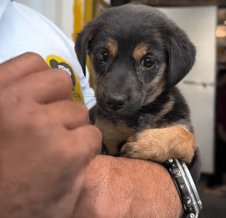 He had fallen into a narrow drainage ditch filled with dirty water and scattered trash. The space was dark, damp, and cold. Surrounded by debris and stagnant water, the small puppy looked fragile and exhausted.