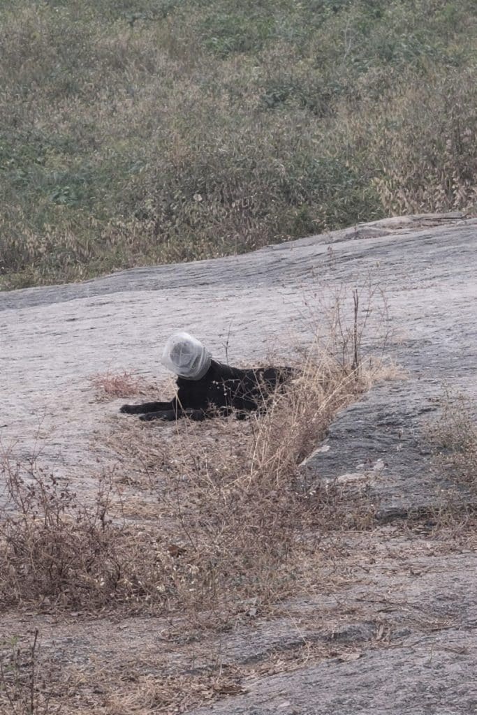 The container covers his face completely, leaving him unable to see properly or reach food and water. Each movement appears cautious and uncertain as he struggles to navigate the uneven ground.