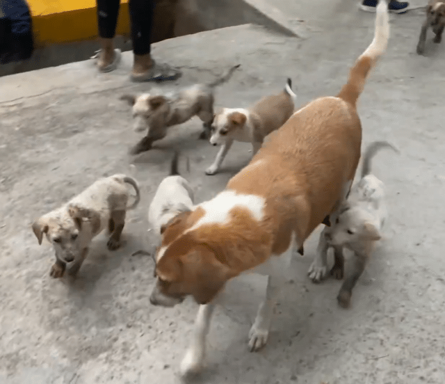 A mother dog paced back and forth above a narrow drainage pipe, her movements restless and urgent. She kept lowering her head toward small cracks and holes in the concrete, trying again and again to squeeze inside.