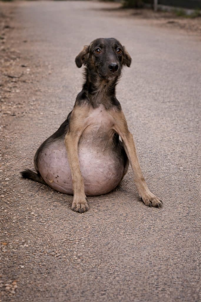 His body was thin and weak, yet his belly was swollen far beyond what seemed normal. The contrast was striking—an exhausted dog carrying a heavy, tight abdomen that made even the smallest movement look uncomfortable.