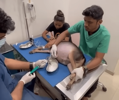 To relieve the pressure inside his abdomen, the veterinary team performed a procedure to carefully drain the accumulated fluid.