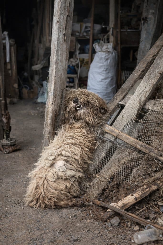 His fur was matted into thick, tangled clumps, covered in dirt and neglect. His body looked fragile beneath it all.