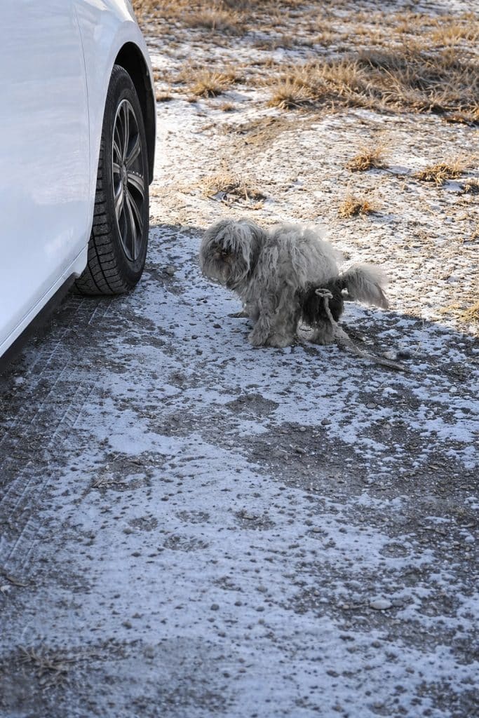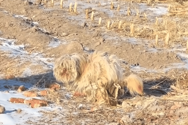 Her fur was heavily matted, tangled with dirt and debris, giving her a rough, uneven appearance. When approached, she barked nervously, keeping her distance.