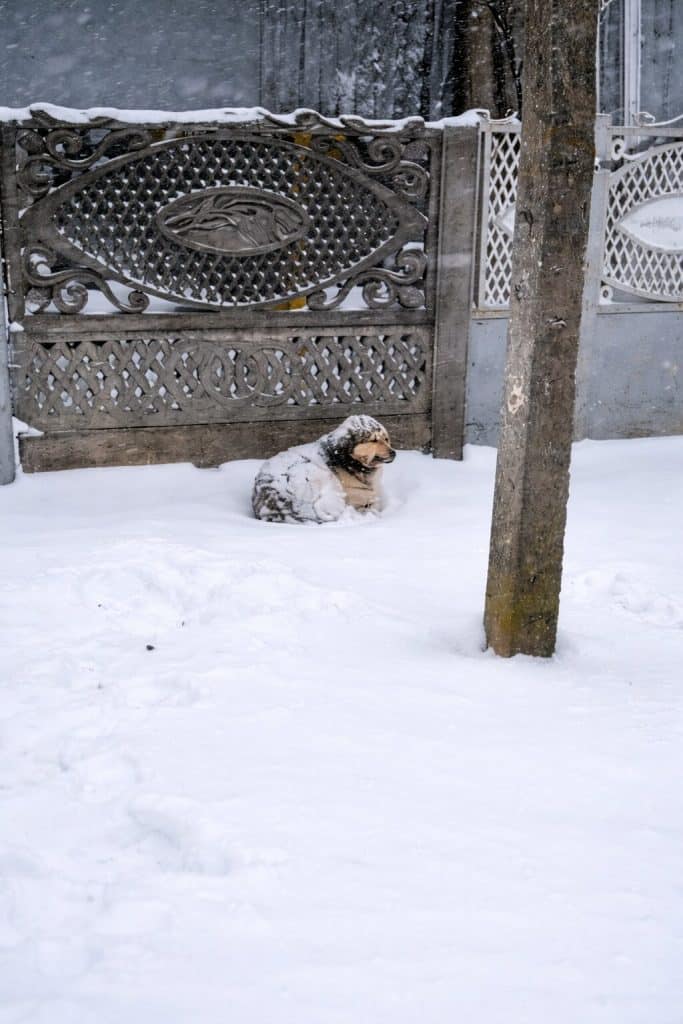 Near the gate of a home, barely visible beneath the white, lay a small dog.