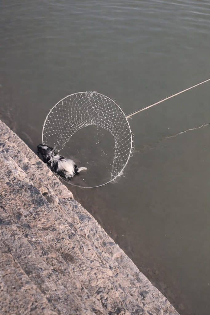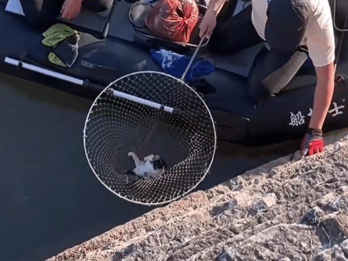 Nearby, a man on a small inflatable boat reached out with a long net, carefully trying to lift the puppies to safety. The situation was tense, every second feeling heavier than the last.