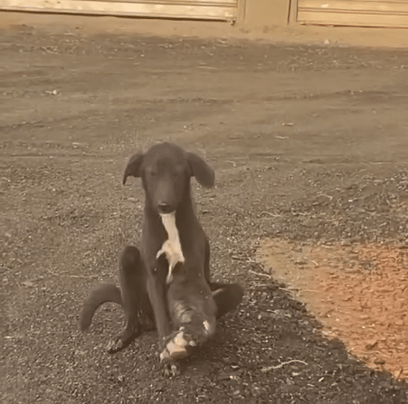 On a quiet stretch of concrete, a small black dog struggled to stay on his feet.