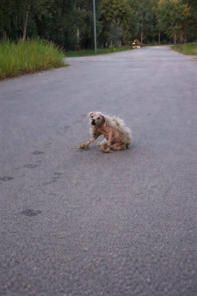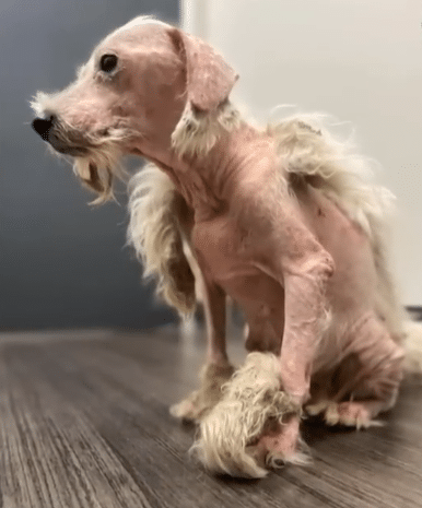 Her fur was nearly gone in many places, replaced by rough, irritated skin. What remained was tangled, heavy, and carried the smell of dirt and neglect. Fleas clung to her, and small wounds marked her fragile body.