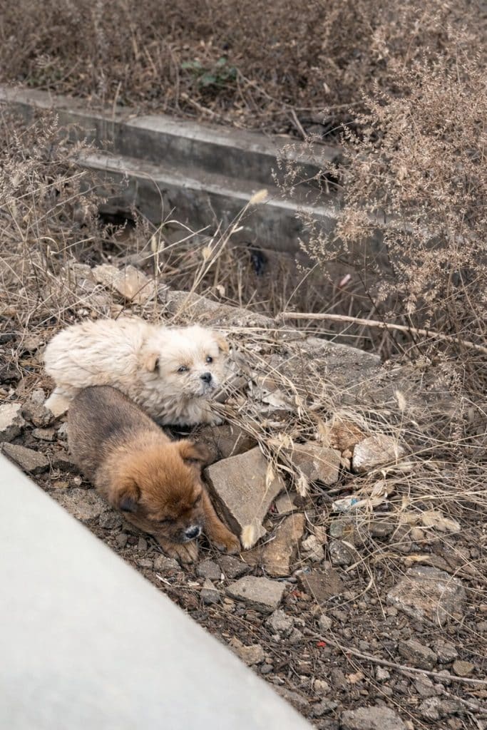 Two tiny puppies—no more than a month or two old—were curled tightly against a stone pillar by the roadside.