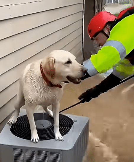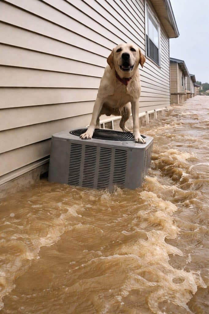 Murky, fast-moving, and relentless, it swept through the streets, leaving little behind. And in the middle of it all, perched on top of a small outdoor air conditioning unit, stood a golden Labrador.