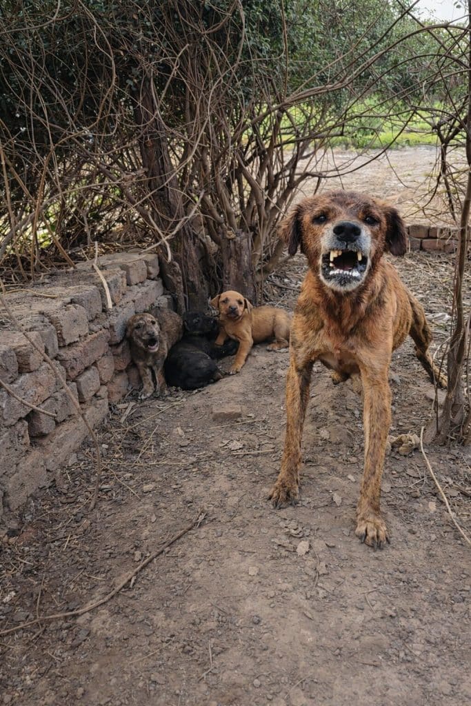 Barking. Growling. Stepping forward, then retreating just enough to stay between her puppies and the unknown.