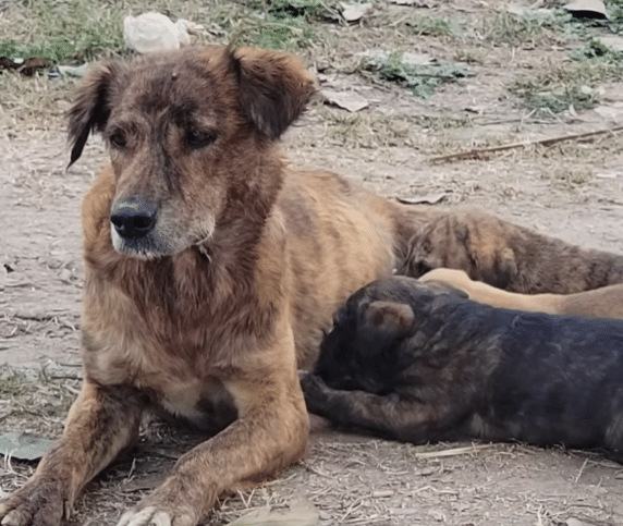 A thin brindle mother dog lay close to the ground, her body curved protectively around her tiny puppies. Their shelter was nothing more than a shallow space beneath a tree — barely enough to shield them from the outside world.