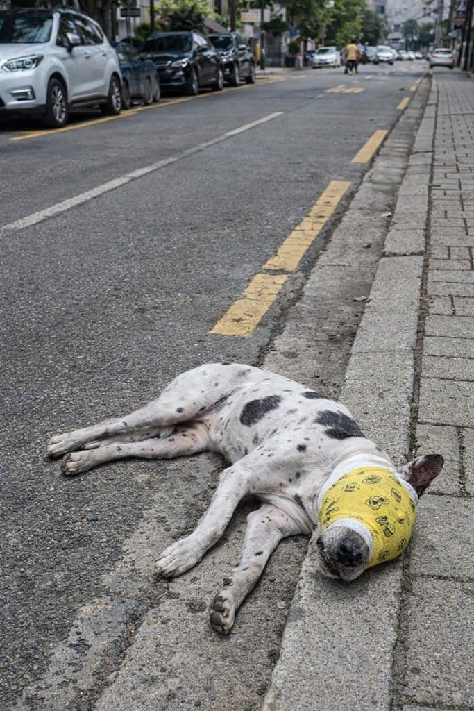 Dragon lay there, motionless, after being struck by a vehicle and left behind. There were no sounds, no cries—only the stillness of a body that had endured too much.