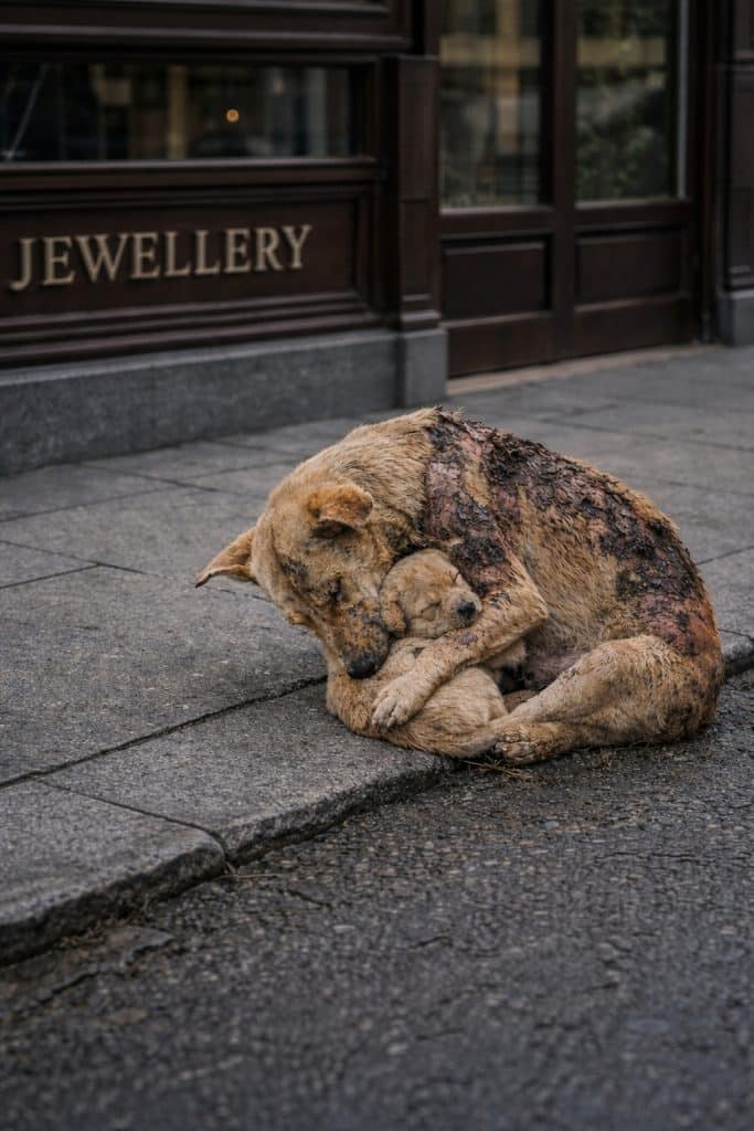 Somewhere along the street, driven by hunger and the quiet urgency of caring for her puppies, she kept searching—hoping to bring something back to them.