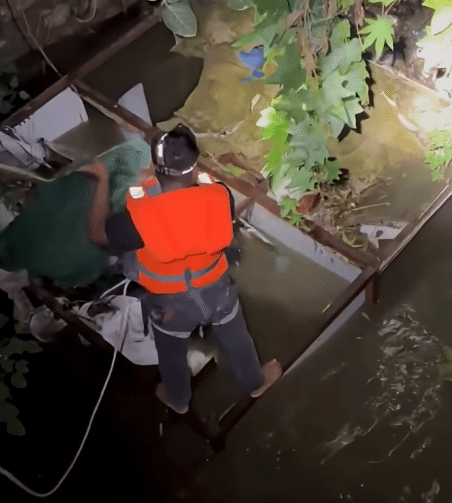 One rescuer stepped forward, fastening a rope around himself before being carefully lowered toward the flood below.