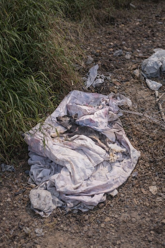 Buried among discarded things, in a place no one expects to find life, a tiny dog lay motionless. Her legs were tied together, her small body curled tightly as if trying to protect what little strength she had left.